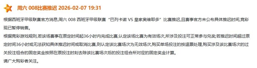 根据西班牙甲级联赛官方消息周六008 西班牙甲级联赛“巴列卡诺VS皇家奥维耶多”比赛推迟,且赛事官方未公布具体推迟时间,竞彩现已暂停销售。