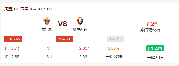 从积分形势来看,埃尔切此役主场作战抢分欲望强烈,球队急需稳固保级位置。但就整体状态而言,埃尔切近期表现起伏较大,防线问题依然突出,稳定性明显不足。反观奥萨苏纳,无论排名还是近期走势均优于对手,且攻防体系更为均衡,客场具备足够的应对能力。数据层面未对主场作战的埃尔切形成实质性倾斜,支持力度较为有限。但奥萨苏纳作为状态与近况都更为突出的一方也同样未得到支持,其实也是一个非常不好的势头,不妨关注主队不败。