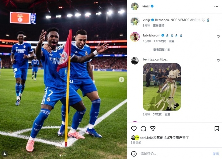维尼修斯在个人社媒平台发布动态,配图(或文字)明确标注“伯纳乌再见!”,同时附言“下回合等着!”,既似对歧视行为的强硬回应,也暗含对后续赛事的宣战姿态,社媒评论区短时间内涌入数万球迷留言。