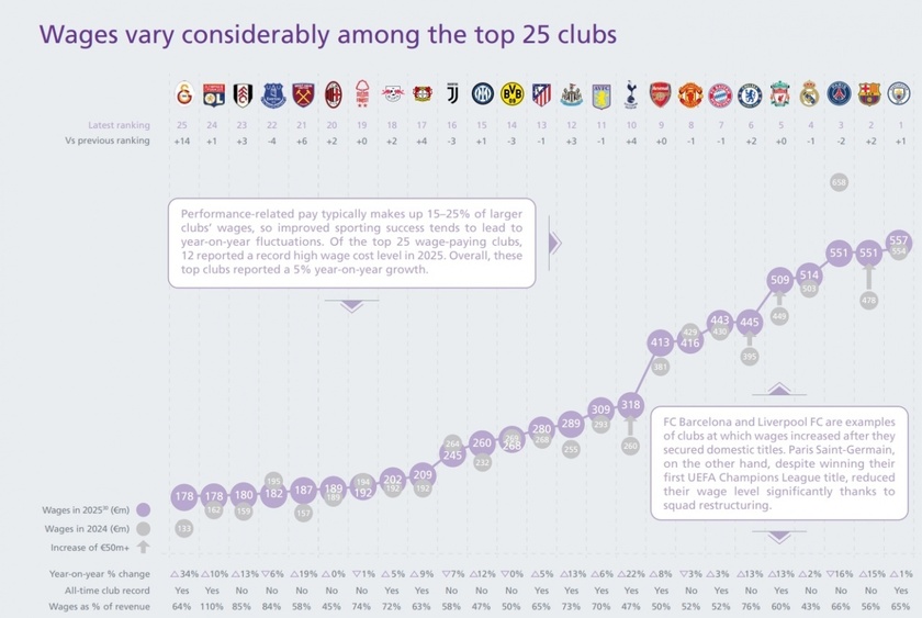 唯彩看球讯 根据最新权威数据公布欧洲足坛薪资支出排名,曼城以5.57亿欧元的薪资支出位居榜首,巴塞罗那、巴黎圣日耳曼、皇家马德里、利物浦等俱乐部薪资支出均超过5亿欧元,豪门薪资投入竞争态势受关注。