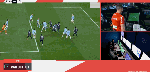 第71分钟,塞尔塔球员尤特格拉在禁区内防守时手球犯规,裁判最初示意点球,但通过VAR回放后,裁判认定琼阿梅尼推人在先,最终取消了点球判罚,引发皇马球员的不满。