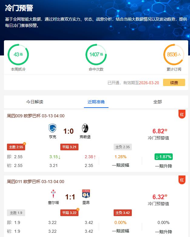 昨日欧罗巴杯亨克VS弗赖堡的比赛中,尽管初始赔率显示弗赖堡取胜的概率较大(胜平负赔率2.55:3.21:2.35),但比赛最终打出了1-0胜的冷门。同时公推塞尔塔1-1平里昂(胜平负赔率1.9:3.22:3.42)等7场比赛同样命中。比赛赛果充分展现了我们工具的精准预测能力。