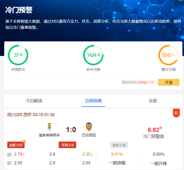 昨日西甲皇家奥维耶多VS巴伦西亚的比赛中,尽管初始赔率显示巴伦西亚取胜的概率较大(胜平负赔率2.67:2.9:2.45),但比赛最终打出了1-0胜的冷门。同时德甲汉堡1-1平科隆(胜平负赔率1.99:3.3:3.1)与意甲国际米兰1-1平亚特兰大(胜平负赔率1.43:4.05:5.45)以及公推赫罗纳3-0胜毕尔巴鄂竞技(胜平负赔率2.58:3.05:2.42)等12场比赛同样命中。一众比赛赛果充分展现了我们工具的精准预测能力。