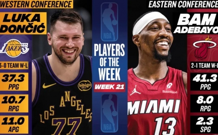 唯彩看球讯 据NBA官方最新公告,北京时间3月17日揭晓了2025-26赛季第21周东西部周最佳球员,湖人后卫卢卡·东契奇与热火中锋巴姆·阿德巴约分别当选,二人凭借上周的统治级表现拿下该项荣誉。