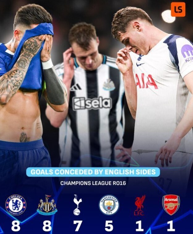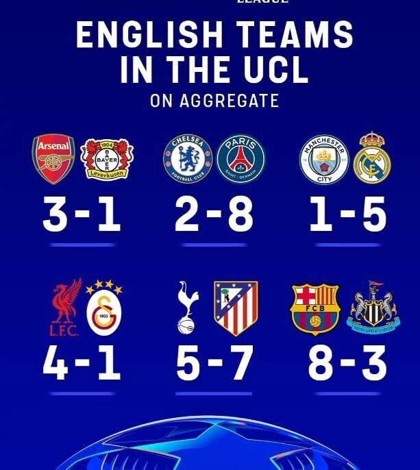 当欧冠1/8决赛次回合的终场哨声全部吹响,英超六强交出的答卷堪称惨不忍睹。6支球队仅有阿森纳、利物浦艰难晋级八强,其余四队悉数折戟。12场比赛狂丢30球的数字,让“世界第一联赛”的光环在这一刻碎得彻底。热刺赢球出局、切尔西创队史最差失球纪录、曼城遭皇马双杀、纽卡被巴萨血洗——英超球队在欧战赛场的集体溃败,比首回合的低迷更令人瞠目结舌。