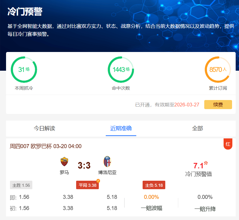 昨日欧联杯罗马VS博洛尼亚的比赛中,尽管初始赔率显示罗马取胜的概率较大(胜平负赔率1.56:3.38:5.18),但比赛最终打出了3-3平的冷门。同时欧会杯AEK拉纳卡1-1平水晶宫(胜平负赔率5.45:3.9:1.45)以及欧联杯里昂0-2负塞尔塔(胜平负赔率1.98:3.23:3.18)两场比赛同样命中。比赛赛果充分展现了我们工具的精准预测能力。