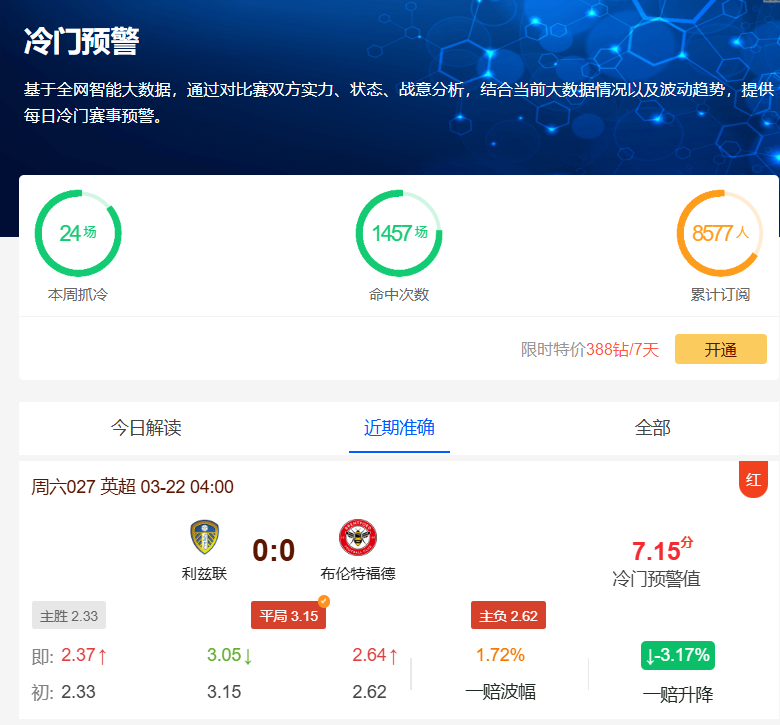 昨日英超利兹联VS布伦特福德的比赛中,尽管初始赔率显示双方分出胜负的概率较大(胜平负赔率2.33:3.15:2.62),但比赛最终打出了0-0平的冷门。同时德甲科隆3-3平门兴格拉德巴赫(胜平负赔率2.08:3.33:2.87)以及公推英超埃弗顿3-0胜切尔西(胜平负赔率3.25:3.25:1.95)等八场比赛同样命中。比赛赛果充分展现了我们工具的精准预测能力。