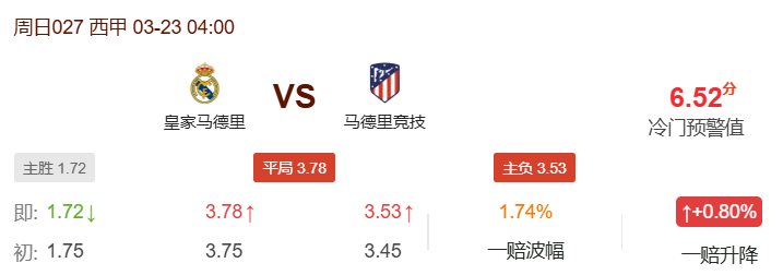 机构对于皇家马德里方向给出了主胜1.72的数据,亚指从让0.5球升至让0.75球,表达了对主场优势和争冠战意的认可。皇家马德里整体实力和主场战绩占据明显优势,进攻火力凶猛。然而马德里竞技近期状态稳定,防守体系严密,且历史交锋在客场不落下风,心理优势十分明显。需要注意的是,皇家马德里遭遇严重伤病潮,多达6名核心球员缺阵,而周中欧冠的消耗更是雪上加霜。此番主场作战的皇家马德里并未展现出绝对的统治力,数据对其的支持力度看似合理,实则忽视了严重的伤病危机与马竞的德比韧性。综合来看,防守稳固、阵容齐整、交锋不落下风的马德里竞技,有望在伯纳乌球场制造冷门,至少带走一分。