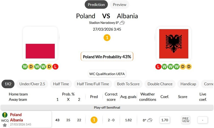 海外情报:【2026欧洲预选附加准决赛】【波兰】VS【阿尔巴尼亚】赛前解析