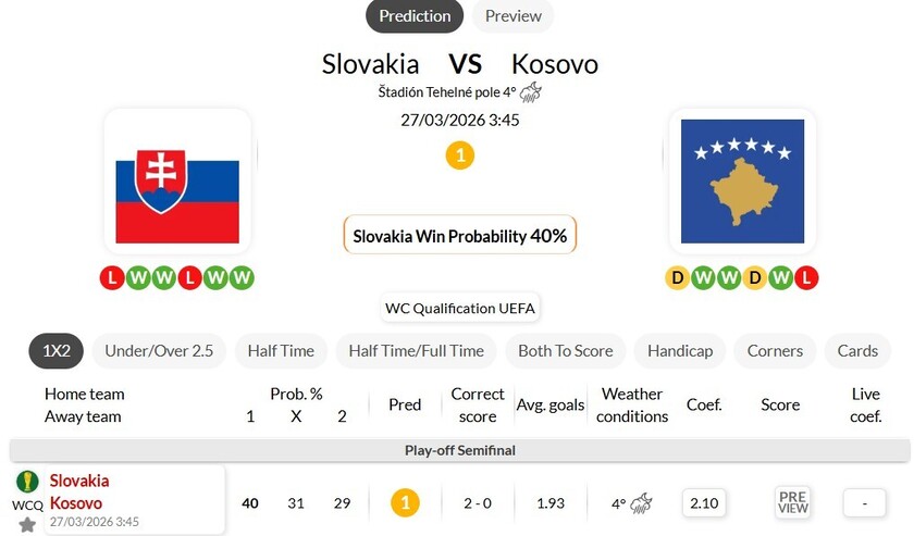 -In their only prior pre-match meeting, Slovakia defeated Kosovo 2-1 in a 2022 friendly match at home.