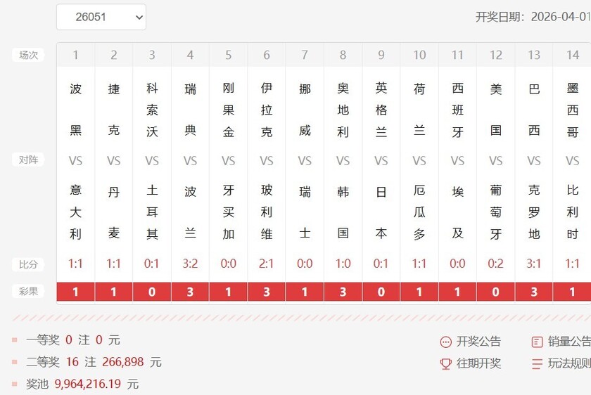 北京时间4月1日,胜负彩第26051期开奖结果揭晓。本期世欧预附加赛与多场友谊赛冷门迭爆,导致十四场头奖空开,奖池滚存9,964,216.19元。