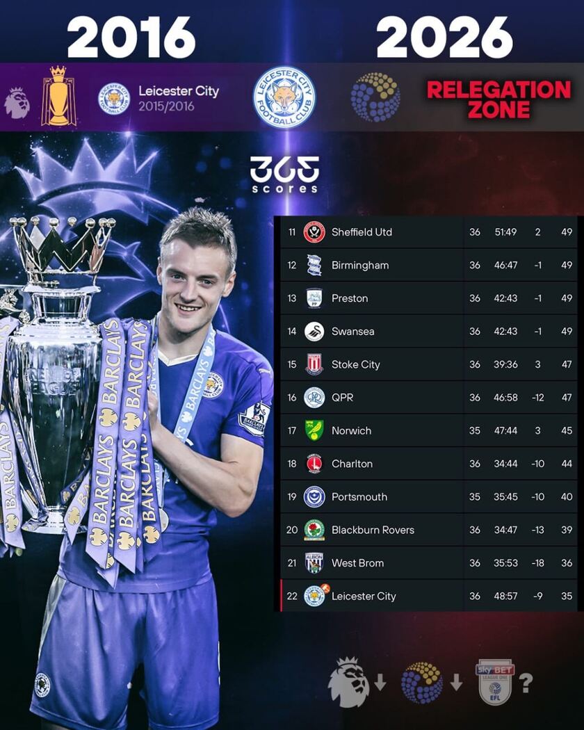 2016年,莱斯特城以5000赔1的逆天赔率登顶英超,写下了世界足坛近代史上最震撼的草根童话。10年后的2026年,这支曾站上英格兰之巅、闯入欧冠八强、捧起足总杯冠军的传奇球队,正站在队史最黑暗的悬崖边——他们不仅在三年内两次从英超降级,更在英冠赛场深陷保级泥潭,距离跌入英格兰第三级别联赛,只剩最后6场比赛的距离。