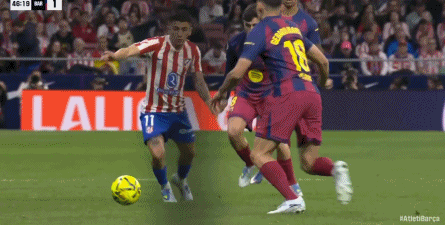 第45+3分钟,冈萨雷斯铲倒亚马尔,主裁判先出示第二张黄牌罚下,VAR介入后改判直接红牌,马竞半场少打一人。
