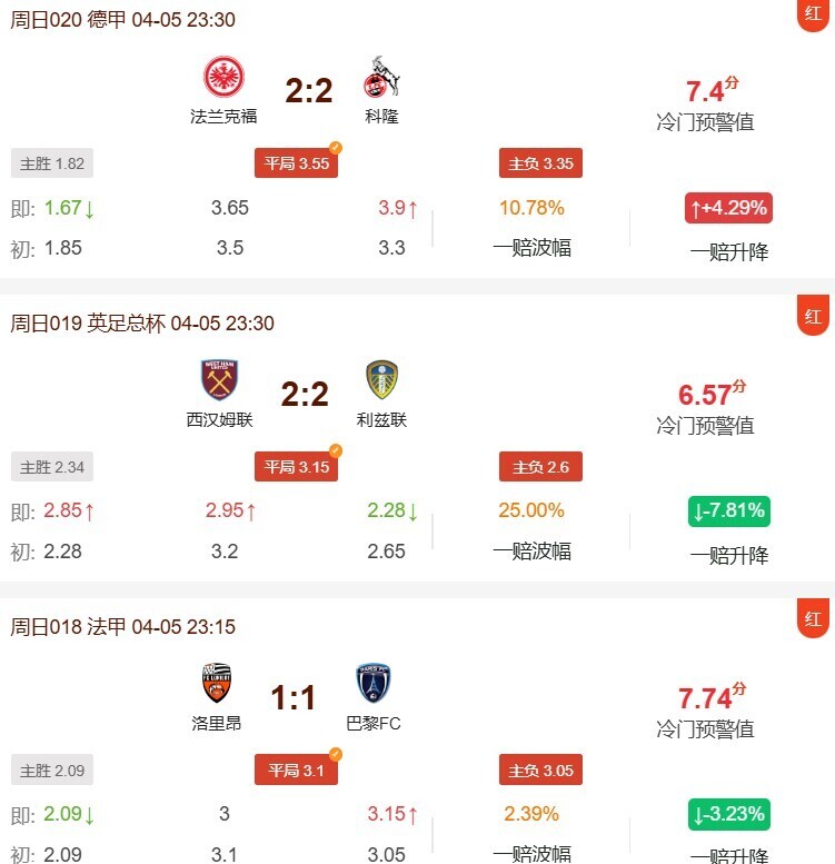昨日我们的冷门预警工具依旧表现抢眼,公推精准命中洛里昂1:1巴黎FC(主胜2.09、平局3.10、主负3.05)。私推方面同样可圈可点,成功锁定西汉姆联2:2利兹联,以及布雷达0:0鹿特丹斯巴达(主胜2.30、平局3.25、主负2.59)等12场冷门赛事,充分验证了工具的实用性和准确性。