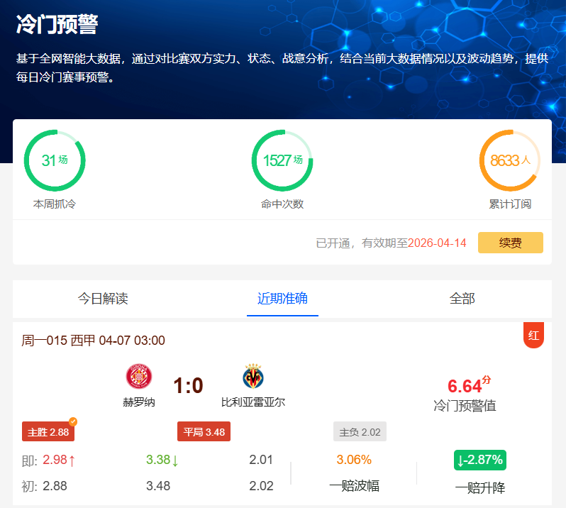 昨日公推西甲赫罗纳VS比利亚雷亚尔的比赛中,尽管初始赔率显示比利亚雷亚尔取胜的概率较大(胜平负赔率2.8:3.48:2.02),但比赛最终打出了1-0胜的冷门。同时英冠朴茨茅斯2-2平牛津联(胜平负赔率1.72:3.2:4.25)以及意甲乌迪内斯0-0平科莫(胜平负赔率4.95:3.55:1.55)等三场比赛同样命中。比赛赛果充分展现了我们工具的精准预测能力。