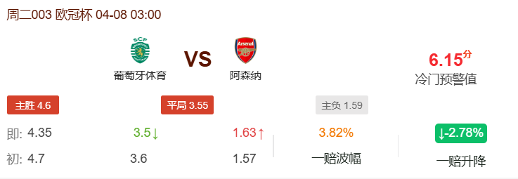 数据对于葡萄牙体育方向给出了主胜4.60的赔率,阿森纳客胜赔率仅为1.59,表达了对英超领头羊实力和欧冠小组赛全胜战绩的认可。阿森纳整体阵容价值高于葡萄牙体育,欧冠小组赛八战全胜的表现也令人印象深刻。然而葡萄牙体育坐拥本赛季欧冠主场全胜的魔鬼主场,近期状态火热且刚刚经历史诗级逆转士气高涨,而阿森纳近期两场杯赛接连失利状态低迷,加上多达5名核心球员因伤缺阵,客场战斗力大打折扣。需要注意的是,阿森纳欧战淘汰赛客场对阵葡萄牙球队的历史魔咒不容忽视,而葡萄牙体育在主场面对强敌时展现出的压迫力与逆转韧性,足以令任何对手胆寒。此番客场作战的阿森纳虽然更被机构看好,但状态、伤病以及历史魔咒的多重隐患使得本场变数极大,数据似乎有点过于高调了,综合来看,更看好主场作战的葡萄牙体育能够保持不败。