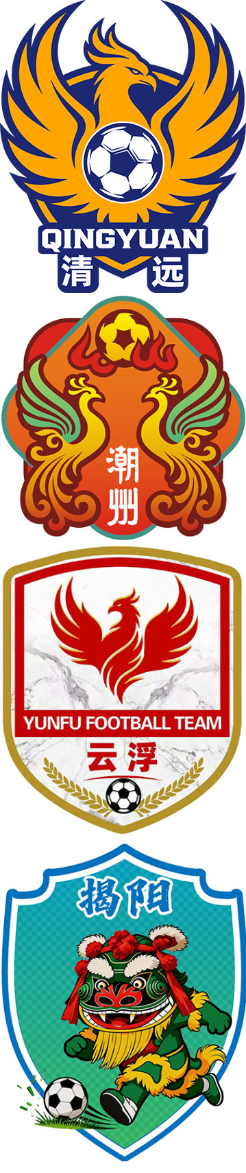 本次粤超21支参赛队伍均采用专属定制队徽,将本地最具代表性的文化符号融入设计。广州队以怒吼雄狮为核心图腾,搭配城市地标彰显球队与城市的血脉羁绊;深圳队以鲲鹏展翅呼应“鹏城”别称,金色与蓝色配色凸显科创活力与拼搏精神;佛山队以醒狮文化为核心,红金配色呼应武术精神与赛场热血;梅州队则融合金柚、梅花与客家围龙屋元素,彰显足球之乡的文化底蕴。