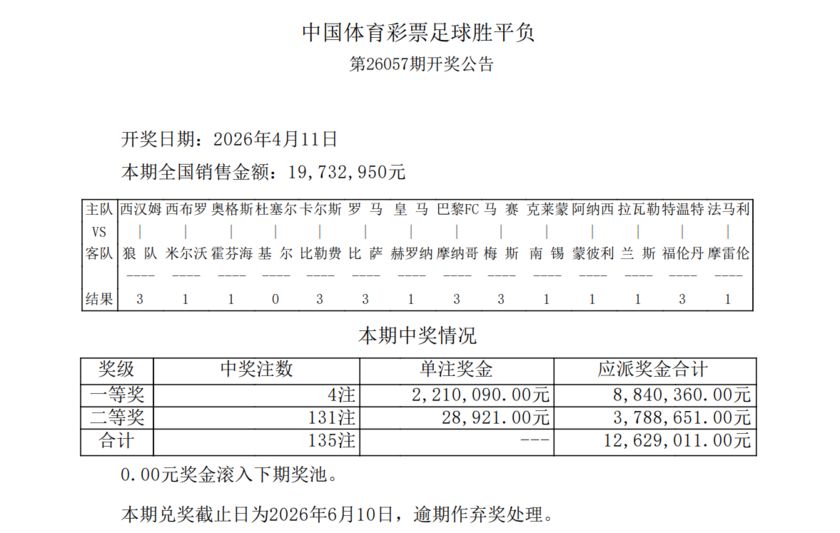 北京时间4月11日,足球彩票第26057期开奖结果揭晓。本期竞猜由西甲、英超、德甲、意甲、法甲、葡超等赛事组成,由于冷门赛果集中爆发,头奖含金量大幅提升。