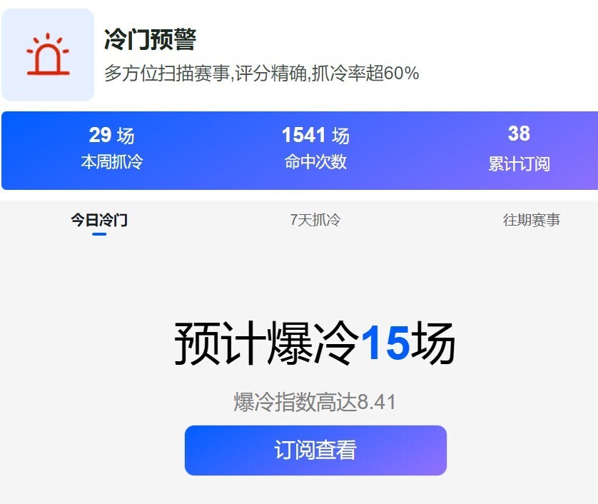 昨日冷门预警公推奥格斯堡2-2霍芬海姆成功命中(胜平负:3.4 3.53 1.81)。私推方面同样表现抢眼,不仅精准命中巴黎FC 4-1摩纳哥的大冷门(主胜3.47、平局3.58、客胜1.78),还成功捕捉了阿纳西0-0蒙彼利埃等共计八场冷门赛果。这一系列准确判断,充分体现了我们工具在冷门捕捉方面的高准确率。