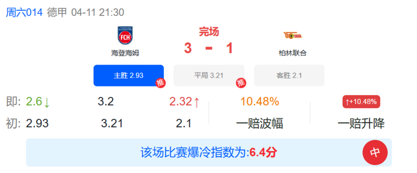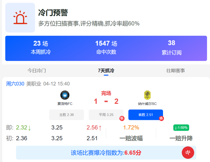 昨日公推德甲海登海姆VS柏林联合的比赛中,尽管初始赔率显示柏林联合取胜的概率较大(胜平负赔率2.93:3.21:2.1),但比赛最终打出了3-1胜的冷门。同时美职联夏洛特FC1-2负纳什维尔(胜平负赔率2.36:3.25:2.51)以及西甲皇家社会3-3平阿拉维斯(胜平负赔率1.57:3.7:4.5)等六场比赛同样命中。比赛赛果充分展现了我们工具的精准预测能力。