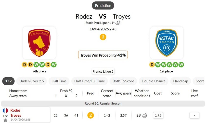 中文解读:本赛季首回合交手,罗德兹主场2-1击败特鲁瓦,心理层面占据一定优势。
