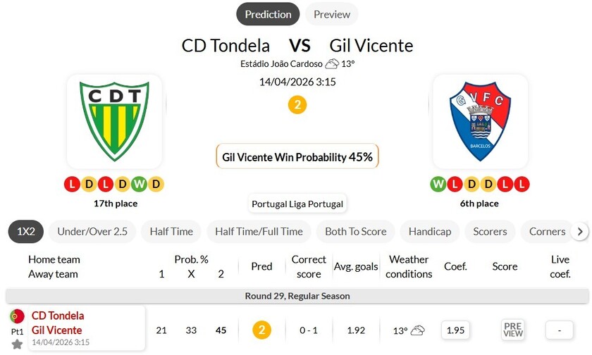 -In the last 10 head-to-head meetings, Tondela have 2 wins, 3 draws and 5 defeats against Gil Vicente, conceding 15 goals in total.