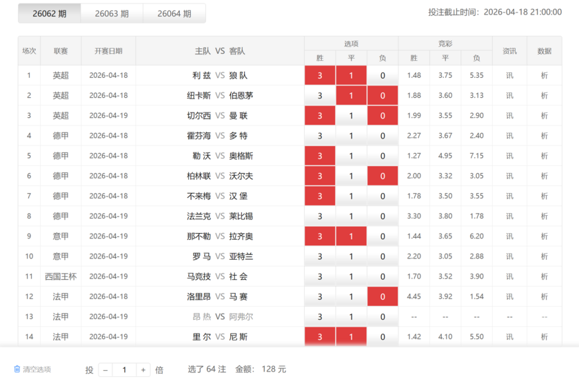 本期胜负彩第26062期由英超、德甲、意甲、国王杯和法甲组成,共计14场较量。英超赛场迎来关键对决,切尔西与曼联上演强强碰撞,纽卡斯尔联对阵状态火热的伯恩茅斯,利兹联则与狼队正面交锋;德甲占据半壁江山,勒沃库森、多特蒙德、莱比锡红牛等劲旅纷纷出战;意甲和法甲赛场同样竞争激烈,那不勒斯与拉齐奥展开焦点对话。然而,大面积伤停成为本期最大变数——纽卡斯尔联失3大主力,切尔西防线告急,沃尔夫斯堡和不莱梅均有大量球员受伤,罗马更是6员大将无缘登场,拉齐奥后场失3大主力,各队阵容不整将为竞猜增添诸多悬念。