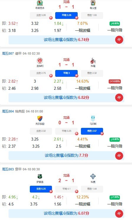 北京时间4月18日,冷门预警为大家罗列各项足球让球胜平负和足球胜平负的赛事误差较大场次,各位球友敬请留意。