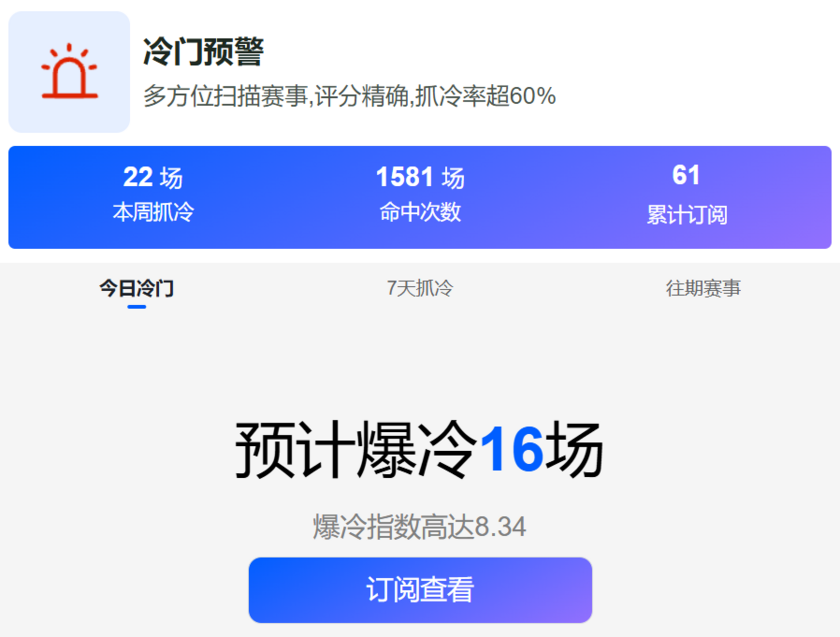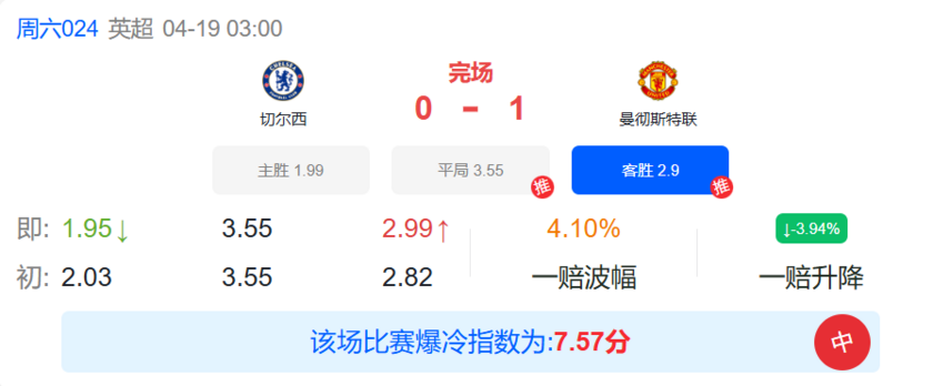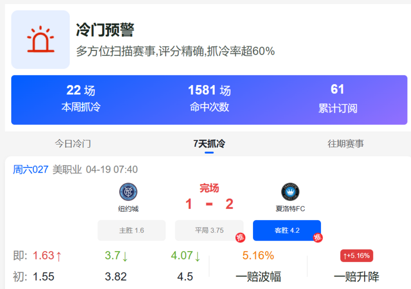 昨日公推英超切尔西VS曼联的比赛中,尽管初始赔率显示切尔西取胜的概率较大(胜平负赔率1.95:3.55:2.9),但比赛最终打出了0-1负的冷门。同时美职联纽约城1-2负夏洛特FC(胜平负赔率1.6:3.75:4.2)以及西杯马德里竞技2-2平皇家社会(胜平负赔率1.7:3.52:3.9)等八场比赛同样命中。比赛赛果充分展现了我们工具的精准预测能力。