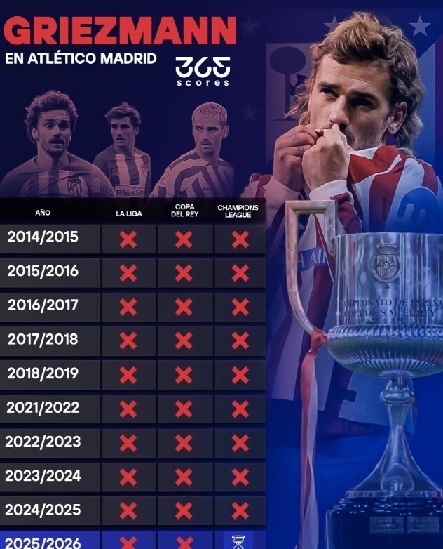 这位法国球星以211粒进球成为马竞队史最佳射手,超越了打进173球的传奇阿拉贡内斯;他还代表红白军团出场488次,位列队史出场榜第四。在十个赛季里,格列兹曼为马竞赢得过三座冠军奖杯——2014年的西班牙超级杯,以及2018年的欧联杯和欧洲超级杯。然而,在长达17年的西甲生涯中,格列兹曼始终未能触碰期盼已久的联赛冠军和欧冠奖杯。