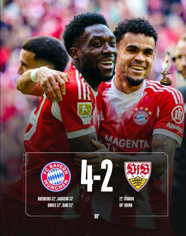 唯彩看球讯 北京时间4月19日,德甲第30轮,拜仁慕尼黑主场迎战斯图加特。上半场斯图加特由菲里希率先破门,随后拜仁凭借格雷罗、雅克松(折射)和戴维斯(折射)连入三球反超;下半场凯恩补射得手,终场前安德烈斯世界波为客队扳回一城。最终拜仁4-2击败斯图加特,提前4轮卫冕德甲冠军,这也是队史第34次夺得德甲联赛冠军。