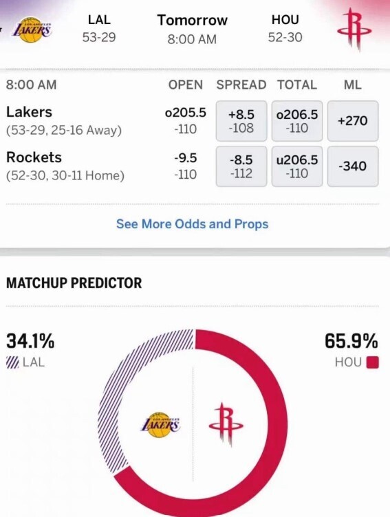 盘口基础数据:初始盘口开出火箭让9.5分,火箭胜赔率-400(即理论胜率80%),湖人胜赔率+310。总分线设定在205.5分。部分平台让分进一步调至8.5分,盘口出现小幅微调但整体维持深盘格局。