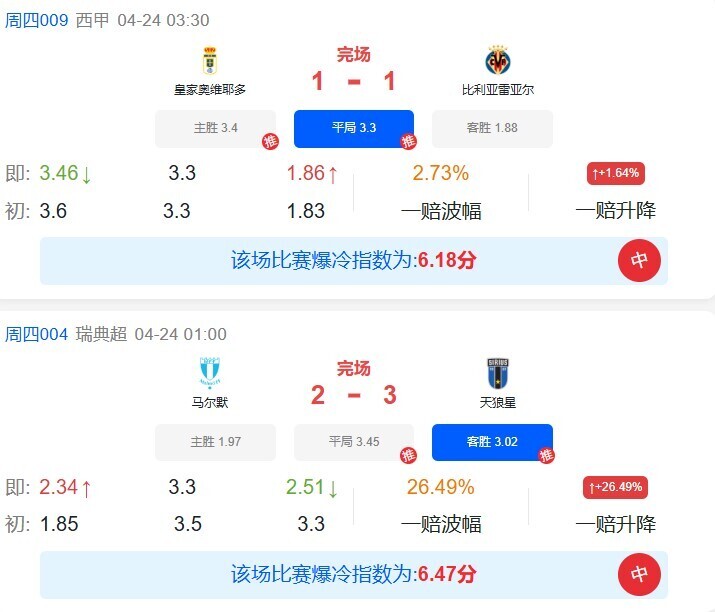 昨日冷门预警公推遗憾失手,但私推表现可圈可点。其中,皇家奥维耶多1-1战平比利亚雷亚尔(主胜3.4、平局3.3、客胜1.88),马尔默2-3不敌天狼星(主胜1.97、平局3.45、客胜3.02)等冷门悉数把握,整体发挥依然出色。