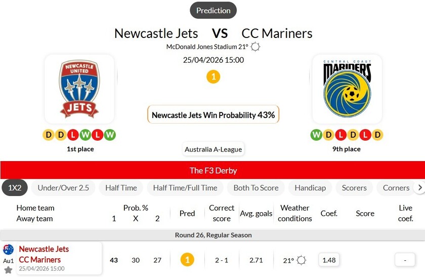 海外情报:2025-2026澳超第26轮 纽卡斯尔喷气机VS中央海岸水手 赛前解析