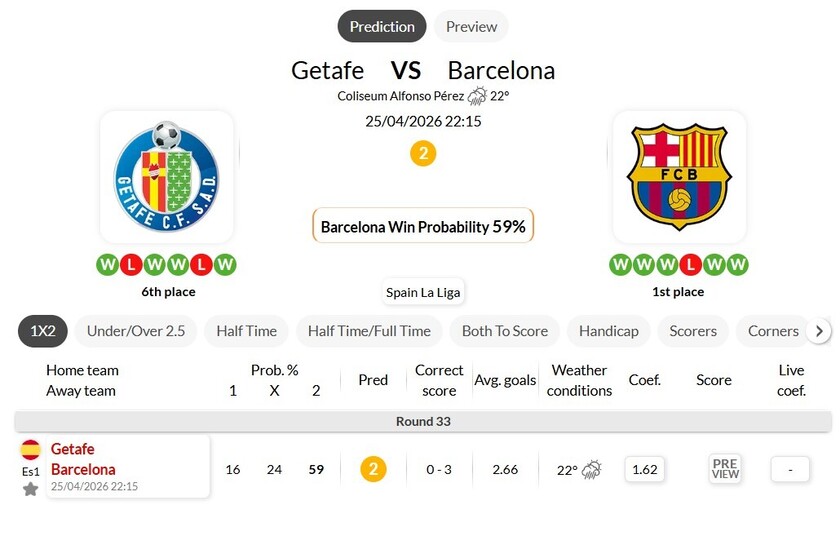 - Getafe sit 7th in La Liga with 44 points from 32 matches, recording 13 wins, 5 draws and 14 defeats.