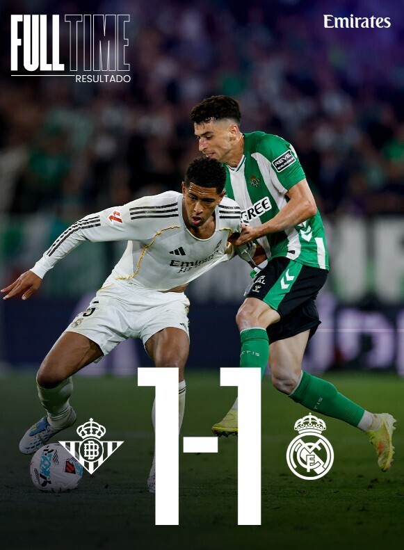北京时间2026年4月25日03:00,2025-26赛季西班牙足球甲级联赛第33轮赛事正式开打,皇家贝蒂斯坐镇贝尼托·比利亚马林球场迎战联赛排名第2的皇家马德里。最终两队经过90分钟鏖战以1-1的比分握手言和,双方均未能全取三分。