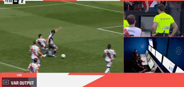 然而在比赛的70分钟,巴列卡诺的迪亚斯帮助巴列卡诺打进扳平比分的进球。没想到这个时候VAR却提醒主裁判,在巴列卡诺进球之前,皇家社会的进攻回合中存在点球嫌疑。