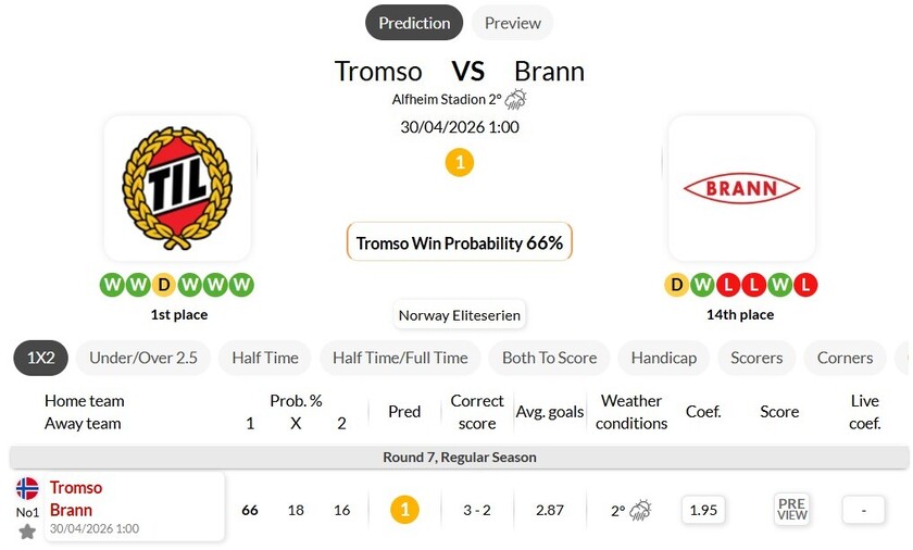 -In the latest encounter in March 2026, Brann lost 1-2 to Tromse at home court.